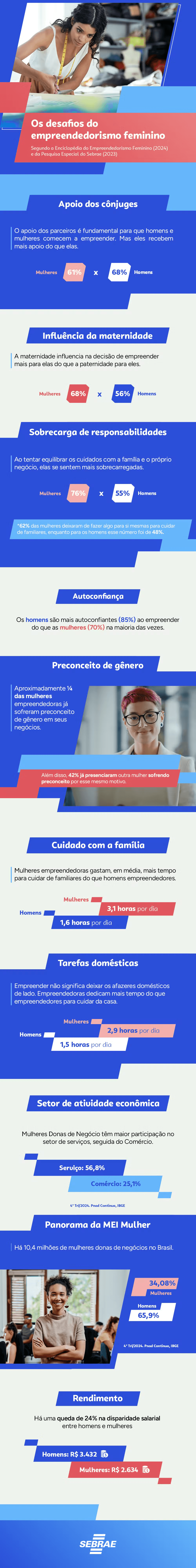 Geórgia Nunes, gerente de empreendedorismo do Sebrae Nacional, destaca que os principais desafios relatados pelas empresárias se referem à sobrecarga de trabalhos domésticos, que não as deixam terem tempo para se dedicarem às suas empresas. “Apesar de o dia ter 24 horas para todo mundo, as tarefas de cuidado com as crianças, com os idosos, com os doentes, com toda a família e com a casa, culturalmente acabam recaindo sobre os ombros das mulheres”, diz a executiva.